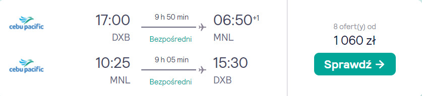 Pierwszym etapem jest przelot samolotem linii Wizz Air na trasie Kraków – Abu Zabi – Kraków. Drugim jest lot z Dubaju na Filipiny (Manila) i z powrotem. Trasę tę pokonasz na pokładzie samolotu linii Cebu Pacific. Bez dodatkowych kosztów na wycieczkę udasz się z małym bagażem podręcznym. Do zakupu biletów nie są potrzebne żadne kluby zniżkowe.