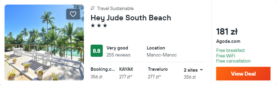 Na wyspie Boracay proponuję ci zakwaterowanie z codziennymi śniadaniami w 3* hotelu Hey Jude South Beach, który znajduje się tuż przy słynnej białej plaży. Wszystkie pokoje są klimatyzowane i posiadają łazienkę oraz balkon, z którego rozpościera się widok na ocean.