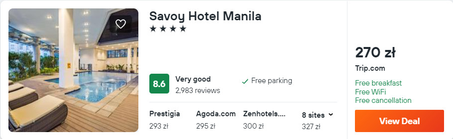 W Manili (na przykład w terminie 7-8 maja) proponuję ci noclegi blisko lotniska w 4* hotelu Savoy. W cenę pobytu wliczone jest śniadania oraz dostęp do sieci WiFi. Wszystkie pokoje są klimatyzowane i wyposażone w telewizor LCD oraz czajnik elektryczny. W łazience jest prysznic.