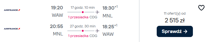 Na wycieczkę do Azji wybierzesz się na przykład w terminie 16 – 24 września. Czeka cię podróż z Warszawy do Manili z Air France. Po drodze przesiądziesz się w Paryżu, a więcej przykładowych dat podróży znajdziesz wypisanych w tekście poniżej.