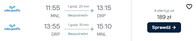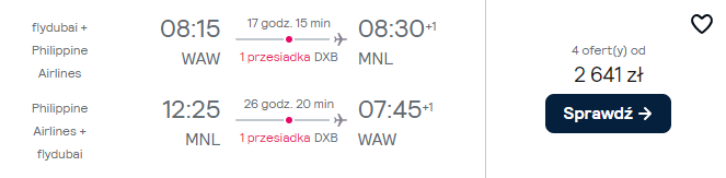 Do Azji wybierzesz się w terminie 3(4) – 18(19) marca 2025 r. Zacznij od rezerwacji lotów z Warszawy do Manili z Flydubai oraz Philipipine Airlines. Po drodze przesiądziesz się w Dubaju. Na tym odcinku przysługują ci aż dwie sztuki bagażu rejestrowanego (nadawanego do luku).