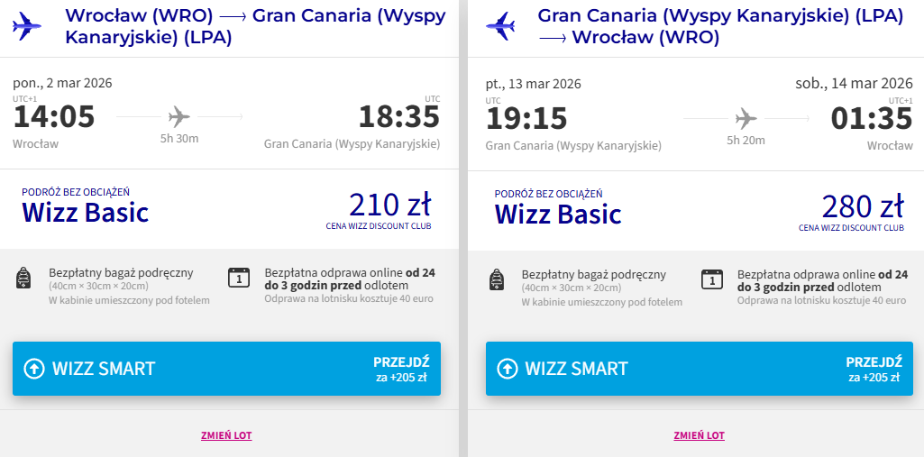 Na Wyspy Kanaryjskie wybierzesz się w terminie 2-13 marca 2026 r. z lotniska we Wrocławiu. Na Gran Canarię polecisz bezpośrednio linią Wizz Air. W cenę biletu wliczony został bagaż podręczny.