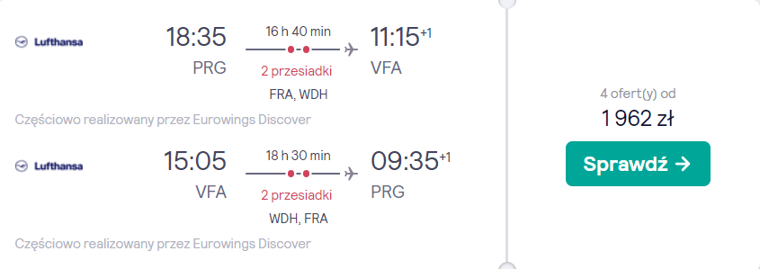 W obie strony polecicie na pokładach samolotów linii Lufthansa oraz Eurowings, a po drodze czeka was przesiadka na lotnisku we Frankfurcie oraz stop techniczny w Windhuk. Bez dodatkowych kosztów zabrać ze sobą będziecie mogli bagaż podręczny oraz przedmiot osobisty (mały plecak lub damską torebkę).