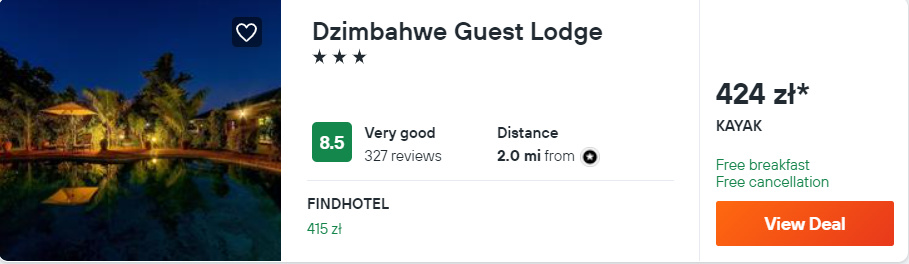 Na miejscu proponuję wam noclegi z codziennymi śniadaniami w 3* hotelu Dzimbahwe Guest Lodge, który od słynnych wodospadów oddalony jest o 2.5 km. Wszystkie pokoje są wyposażone w klimatyzację oraz łazienkę z prysznicem. Na terenie obiektu znajduje się odkryty basen, a we wszystkich pomieszczeniach będziecie mieć zapewniony dostęp do sieci WiFi.
