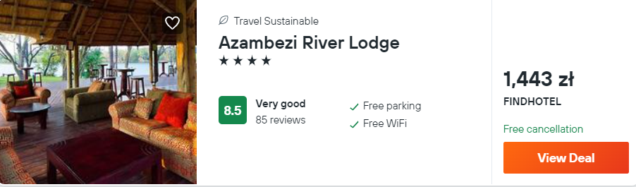 Jesteście w stanie przeznaczyć nieco więcej na zakwaterowanie? W takim razie rozważcie ofertę pobytu w 4* hotelu Azambezi River Lodge, który znajduje się w sąsiedztwie parku narodowego Zambezi. Wszystkie pokoje zostały wyposażone w klimatyzację, telewizor LCD, minibar oraz czajnik elektryczny. W każdym jest łazienka z wanną i prysznicem.