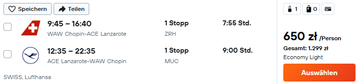 Do Hiszpanii wybierzesz się w terminie 11-15 stycznia 2026 r. z lotniska w Warszawie. Na Lanzarote polecisz linią SWISS z przesiadką w Zurychu, a wrócisz linią Lufthansa z przesiadką w Monachium. W cenę biletu wliczony jest bagaż podręczny i przedmiot osobisty.