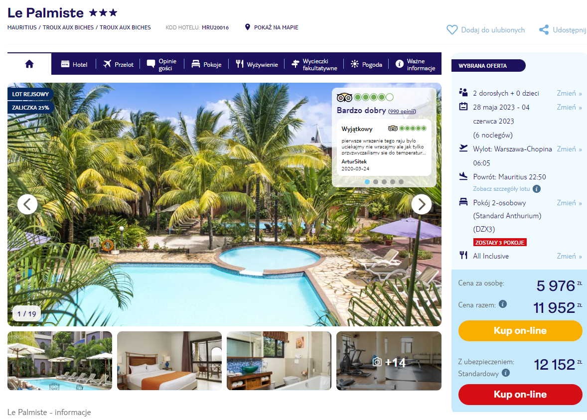 Wczasy spędzisz w świetnym 3* hotelu La Palmiste. Znajduje się on niedaleko plaży, w otoczeniu ogrodu palmowego. Dla gości przygotowano tam komfortowe noclegi w klimatyzowanych pokojach. Na miejscu będzie okazja zrelaksować się w kompleksie odkrytych basenów oraz spróbować lokalnych pyszności w restauracji serwującej specjały kuchni kreolskiej i międzynarodowe – oczywiście w wydaniu all inclusive!