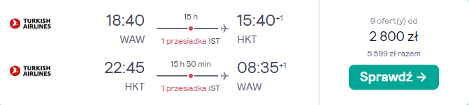 Do Azji Południowo-Wschodniej udasz się w terminie 7(8) – 15(16) listopada. Czekają cię loty z Warszawy na Phuket, realizowane na pokładzie samolotów linii Turkish Airlines. Po drodze zaplanowano bezpieczne, gwarantowane przez przewoźnika przesiadki w Stambule. W cenę wliczono podróż z bagażem rejestrowanym (nadawanym do luku).