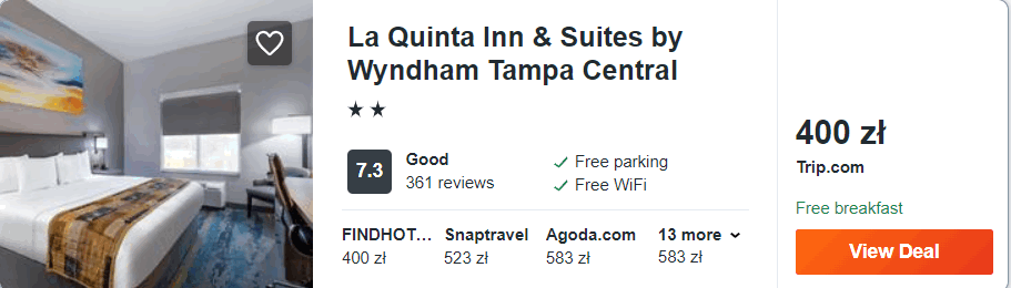 NatomiastNatomiast w Tampie proponuję wam noclegi z codziennymi śniadaniami w hotelu La Quinta Inn & Suites by Wyndham Tampa Central. Wszystkie pokoje wyposażone są klimatyzację, telewizor LCD, kuchenkę mikrofalową i minibar. Na terenie obiektu znajduje się odkryty basen.