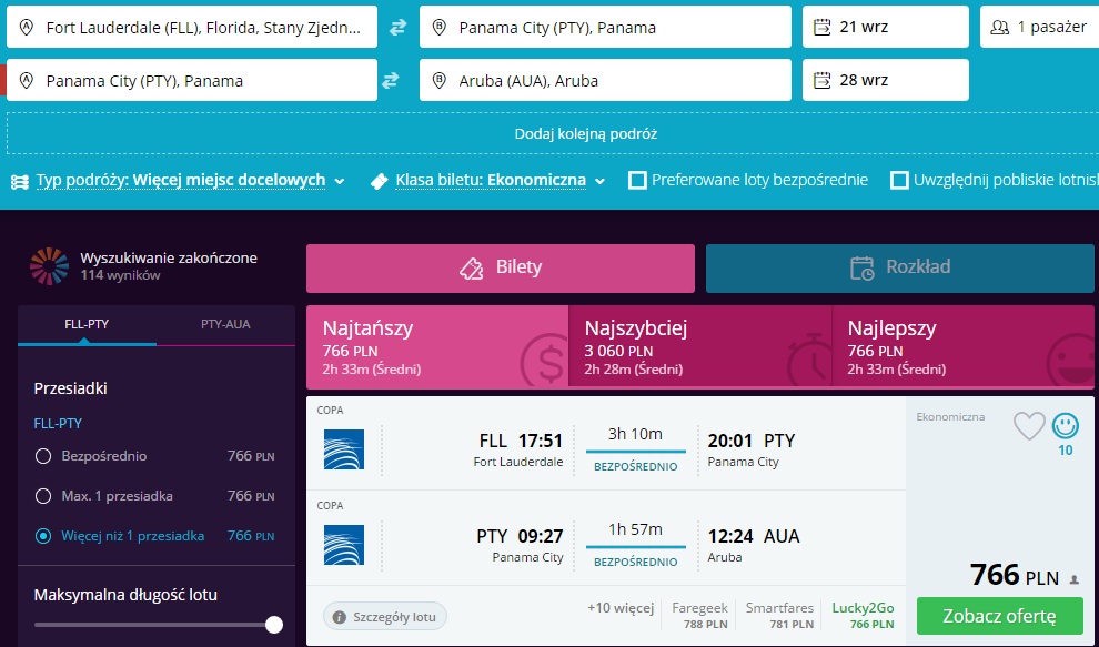 Copa Airlines | Fort Lauderdale 17:51 – Panama 20:01 | 766 PLN | 21, 23, 24 września