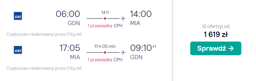 Do Miami polecicie na pokładach samolotów linii Scandinavian Airlines System, z portu lotniczego im. Lecha Wałęsy oraz z warszawskiego lotniska im. Chopina. Po drodze czekać was będą komfortowe przesiadki na lotniskach w Kopenhadze oraz Oslo. W cenie biletu zabrać ze sobą będziecie mogli bagaż podręczny oraz jeden przedmiot osobisty (mały plecak lub damską torebkę).
