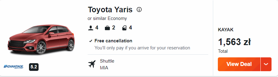 Nierozłącznym elementem podróżowania po Stanach jest samochód, dlatego zachęcam was do wypożyczenie auta zaraz po przylocie do Miami. Za wynajem Toyoto Yaris lub zbliżonego modelu zapłacicie 156 PLN/doba.
