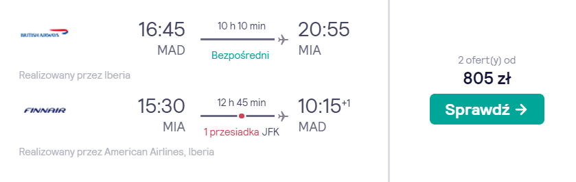 Następnie czeka was przelot ze stolicy Hiszpanii do Miami i z powrotem. Trasę tę pokonacie na pokładach samolotów wchodzących w skład sojuszu Oneworld (np. American Airlines, Iberia). Bez dodatkowych kosztów do Stanów Zjednoczonych udacie się z małym bagażem podręcznym.