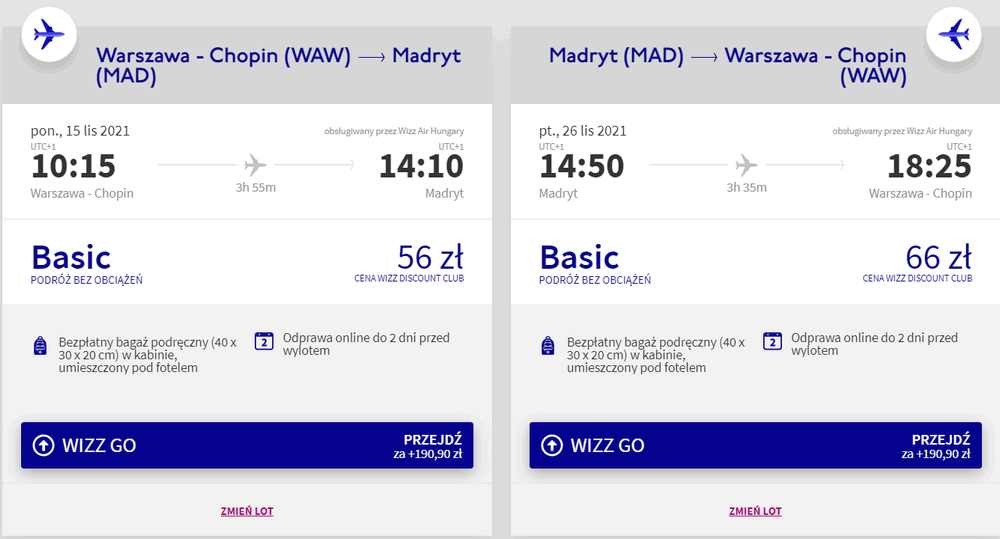 Aby móc skorzystać z podróży w tak rewelacyjnej cenie, będziecie musieli dokonać dwóch oddzielnych rezerwacji przelotów. Pierwszym etapem będzie lot na trasie Warszawa – Madryt – Warszawa. Trasę tę pokonacie na pokładzie samolotu linii Wizz Air, a za bilety zapłacicie tylko 122 PLN. W takiej kwocie polecą członkowie Wizz Discount Club, osoby bez WDC zapłacą nieco więcej.