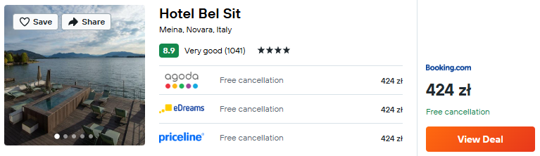 Natomiast nad Maggiore rekomenduję 4* hotel Bel Sit. do twojej dyspozycji będzie między innymi siłownia oraz otwarty basen z którego rozciąga się piękny widok na jezioro.