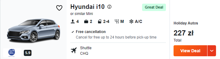 Na lotnisku wypożyczcie samochód, który ułatwi wam zwiedzanie wyspy. Za wynajem Hyundaia i10 lub podobnego modelu zapłacicie tylko 56 PLN za dobę.