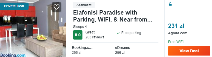 Natomiast w Elafonissi proponuję wam zakwaterowanie w apartamencie, który zlokalizowany jest w pobliżu plaży. Do waszej dyspozycji zostanie oddana m.in.: kompleksowo wyposażona kuchnia, balkon, salon z TV i prywatna łazienka.