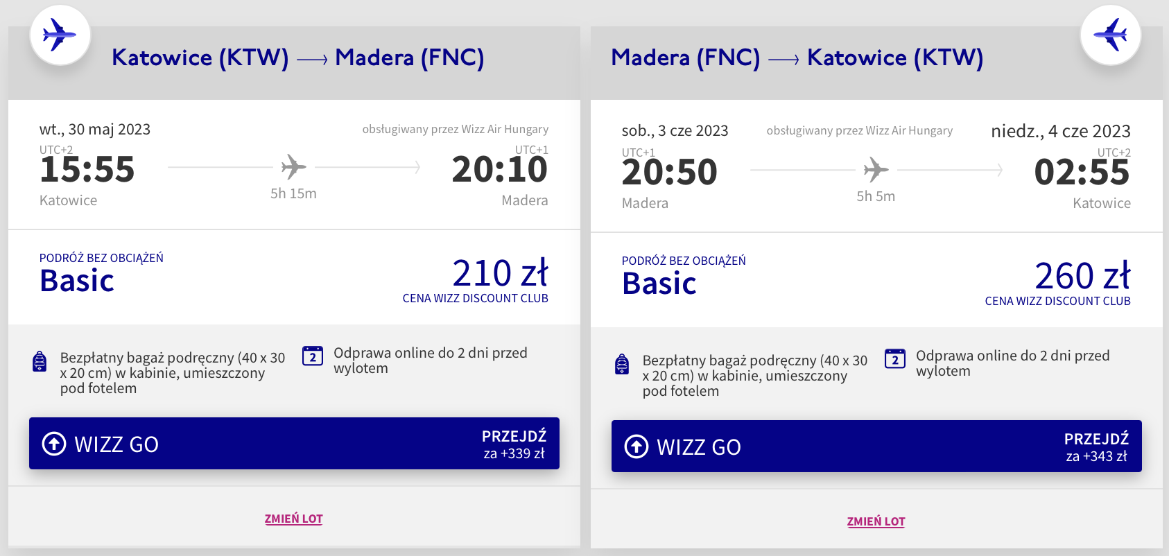 Do Portugalii udasz się w dniach 30 maja – 3 czerwca. Czeka cię bezpośredni lot z Pyrzowic, realizowany na pokładzie samolotu linii lotniczej Wizz Air. Bilety w najniższej cenie dostępne są dla członków Wizz Discount Club. Chętni na loty bez WDC zapłacą więcej.