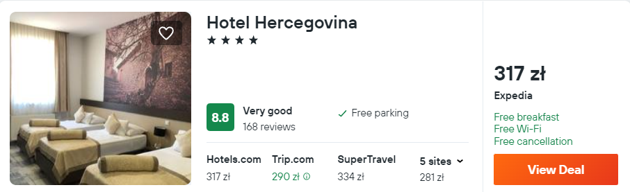 Natomiast w Sarajewie rekomenduję 3* hotel Herc, który zlokalizowany jest niedaleko centrum stolicy. Do twojej dyspozycji zostanie oddany pokój z prywatną łazienką i dostępem do WiFi.