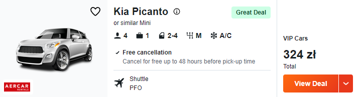 Na lotnisku polecam wam wynajęcie samochodu, który ułatwi wam poruszanie się po wyspie. Za wypożyczenie Kii Picanto lub podobnego modelu zapłacicie w sumie 324 PLN.