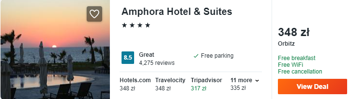 W Pafos polecam wam noclegi w 4* hotelu Amphora. To rewelacyjnie oceniany obiekt, który znajduje się w pobliżu centrum miasta. Do waszej dyspozycji będzie prywatna plaża, basen i siłownia. Otrzymacie też darmowe śniadania.
