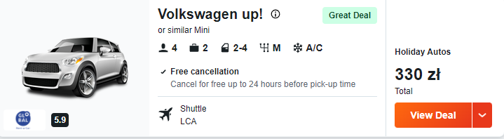 Na lotnisku w Larnace wypożyczcie samochód, który ułatwi wam zwiedzanie wyspy. Za tygodniowy wynajem Volkswagena up! lub podobnego modelu zapłacicie w sumie 330 PLN.