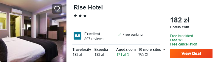 W Larnace proponuję wam noclegi w 3* hotelu Rise. To świetnie oceniany obiekt, który zlokalizowany jest w centrum miasta. Na miejscu będziecie mogli skorzystać z darmowego Wi-Fi i bezpłatnego parkingu. W cenę wliczono śniadania.