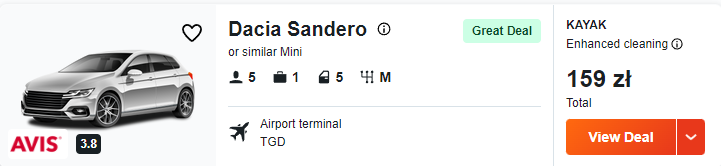 Na lotnisku w Podgoricy wypożyczcie samochód, który ułatwi wam zwiedzanie Czarnogóry. Za tygodniowy wynajem Dacii Sandero lub podobnego modelu zapłacicie w sumie 159 PLN.