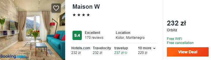 W Kotorze polecam wam noclegi w 4* hotelu Maison W. To luksusowy obiekt, który zlokalizowany jest przy samym wybrzeżu. Z pokojów rozpościerają się piękne widoki na okolicę. Na miejscu znajdziecie basen i skorzystacie z darmowego Wi-Fi.