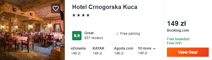 W Podgoricy zatrzymajcie się w klimatycznym 4* hotelu Crnogorska Kuca. To wyjątkowy obiekt, który wykończony jest w tradycyjny sposób. Dotychczasowi goście pozytywnie oceniają pobyt w tym miejscu. Otrzymacie darmowe śniadania.
