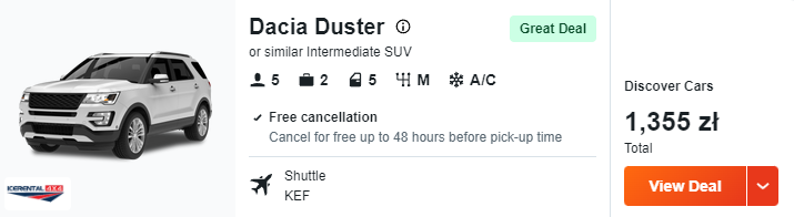 Na lotnisku odbierzcie samochód i ruszcie odkrywać piękno Islandii. W przemierzaniu wyspy pomoże wam Dacia Duster lub podobny SUV, który świetnie sprawdzi się w trudnych warunkach. Za tygodniowy wynajem zapłacicie w sumie 1355 PLN.