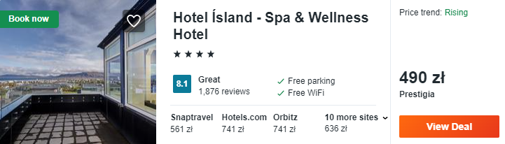 W Reykjaviku rekomenduję wam noclegi w 4* hotelu Ísland – Spa & Wellness. To bardzo komfortowy obiekt, który zlokalizowany jest w centrum miasta i oferuje swoim gościom darmowe miejsce parkingowe. Co więcej, na miejscu znajdziecie strefę spa i siłownię.