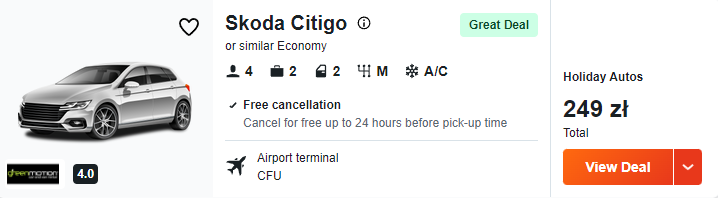 Na Korfu wypożyczcie samochód, który ułatwi wam zwiedzanie wyspy. Za wynajem Skody Citigo lub podobnego modelu zapłacicie niecałe 50 PLN/dzień.