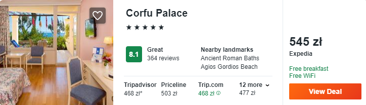 W Korfu zatrzymajcie się w 5* hotelu Corfu Palace. To bardzo luksusowy obiekt, który znajduje się bezpośrednio przy plaży. Na miejscu będziecie mogli korzystać z basenu, siłownii i strefy spa. W cenę wliczono śniadania.