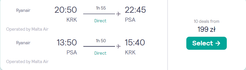 Do Włoch udasz się w terminie 18 – 22 marca. Podróż rozpoczniesz i zakończysz na lotnisku w Krakowie, na pokładzie samolotu linii Ryanair. Bez dodatkowych kosztów do Pizy polecisz z bagażem podręcznym.