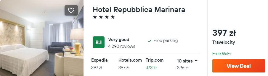 W Pizie proponuję ci zakwaterowanie w 4* hotelu Repubblica Marinara. Dotychczasowi goście bardzo pozytywnie oceniają pobyt w tym miejscu.