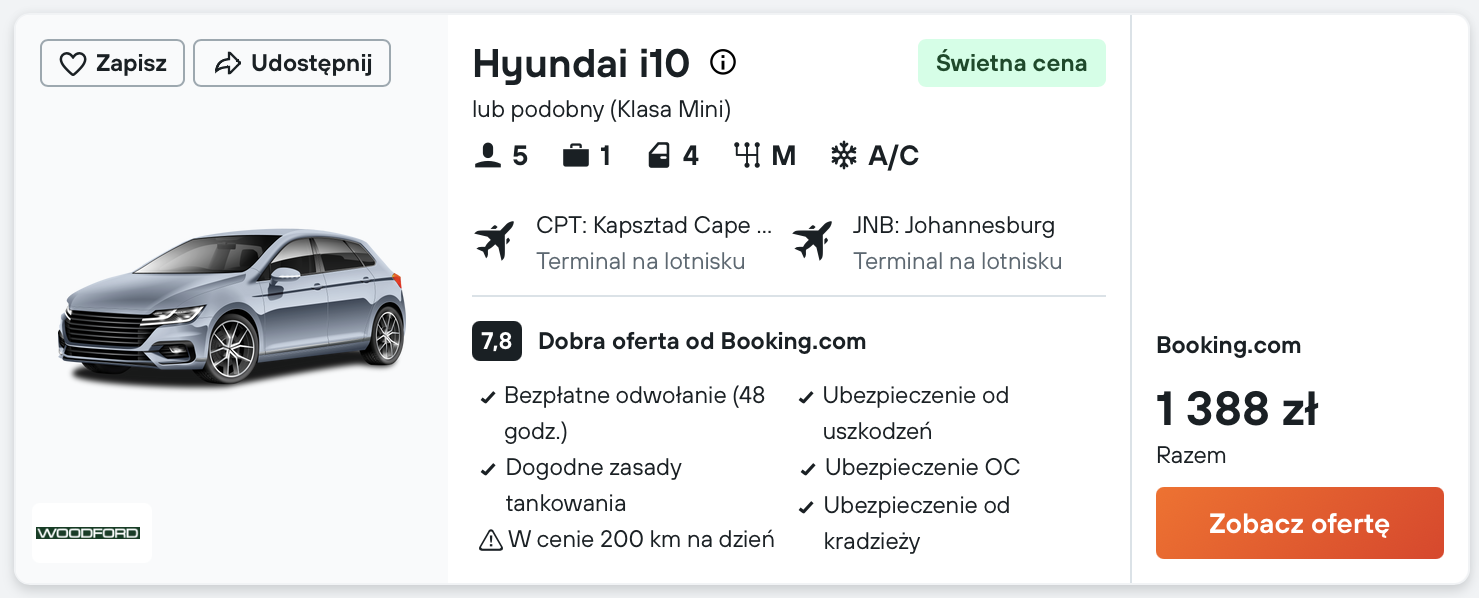 W cenę biletów wliczony jest bagaż podręczny oraz rejestrowany. Zaraz po wylądowaniu w Afryce polecam wynajęcie samochodu, który ułatwi ci zwiedzanie i dostanie się do Johannesburga, gdzie zakończysz podróż.
