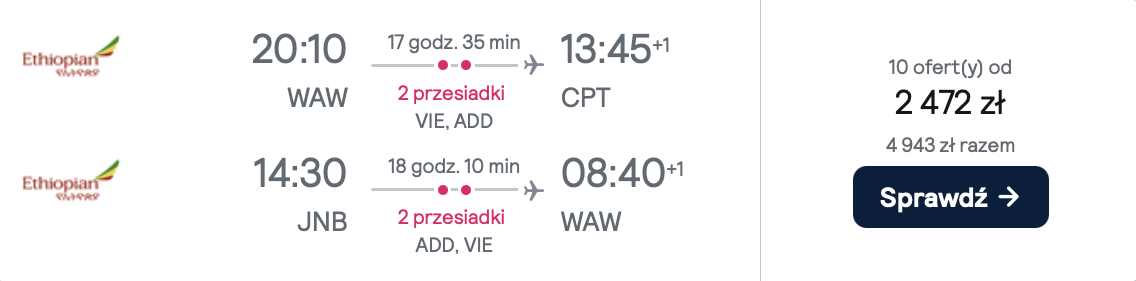 Do Republiki Południowej Afryki udasz się z Warszawy w terminie 13 maja – 2 czerwca. Wylądujesz w Kapsztadzie, a do Polski wrócisz z Johannesburga. W obie strony polecisz linią Ethiopian Airlines. Po drodze czeka cię stop techniczny w Wiedniu (bez wysiadania z samolotu) oraz przesiadka w Etiopii.