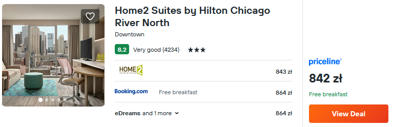 W Chicago zatrzymaj się w bardzo dobrze ocenianym 3* hotelu Home2 Suites by Hilton. W cenę pobytu wliczone są śniadania.