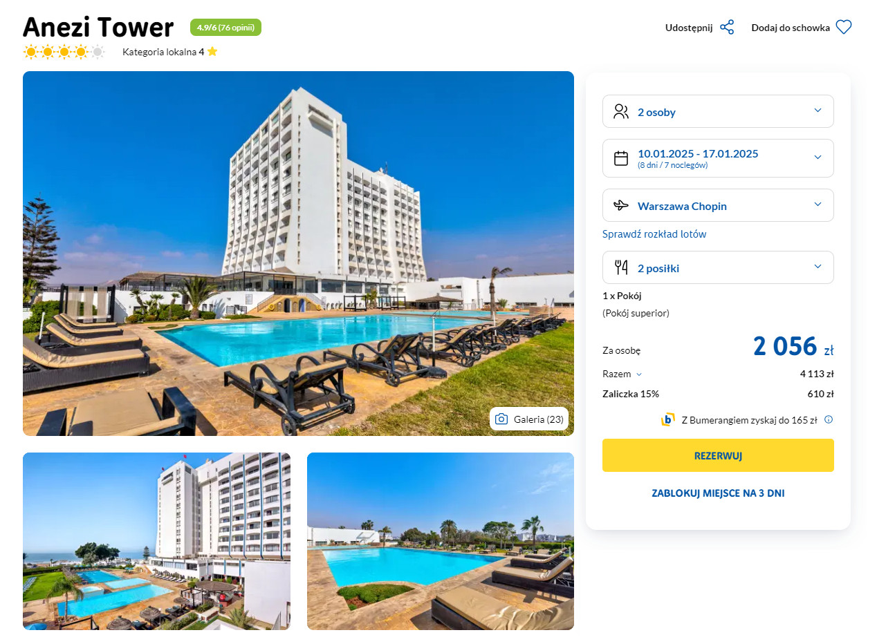 W Agadirze zatrzymasz się w 4* hotelu Anezi Tower, który od plaży (leżaki i parasole – bezpłatne) oddalony jest o 300 metrów. Na terenie obiektu znajdują się trzy odkryte baseny. Każdy pokój wyposażony jest w klimatyzację, telewizor LCD, lodówkę oraz czajnik elektryczny. W łazience jest wanna z prysznicem oraz podstawowe przybory toaletowe. Na terenie całego obiektu będziesz miał zapewniony dostęp do sieci WiFi.