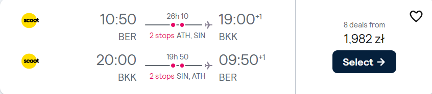 Do Bangkoku udasz się z portu lotniczego Berlin Brandenburg w terminach pomiędzy lutym a marcem przyszłego roku. W obie strony polecisz linią Scoot ze stopem technicznym w Atenach (bez opuszczania samolotu) oraz przesiadką w Singapurze. Bez dodatkowych kosztów do Azji udasz się z dwiema sztukami bagażu podręcznego.