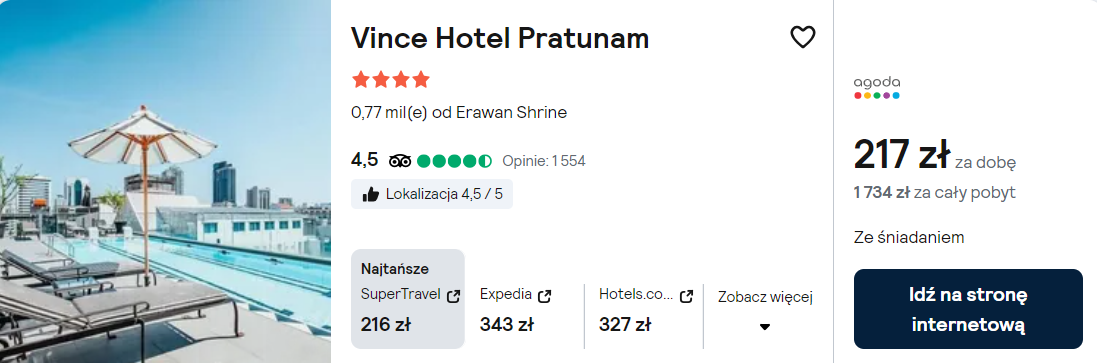 W stolicy Tajlandii proponuję ci noclegi w 4* hotelu Vince Pratunam z odkrytym basenem na dachu. W cenie zapewnione będziesz miał codzienne śniadania oraz dostęp do sieci WiFi.
