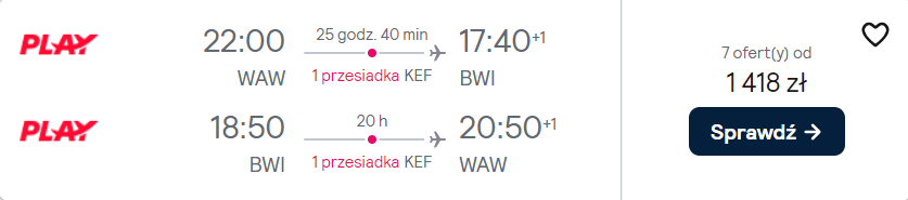 Do Baltimore, Bostonu, Nowego Jorku (lotnisko Stewart), Toronto (lotnisko Hamilton) oraz Waszyngtonu udasz się z warszawskiego lotniska im. Fryderyka Chopina. Na każdej trasie polecisz linią Play z przesiadkami w Reykjavíku. W cenie zabrać ze sobą możesz bagaż podręczny. W niektórych przypadkach czeka cię dłuższy przystanek na Islandii.