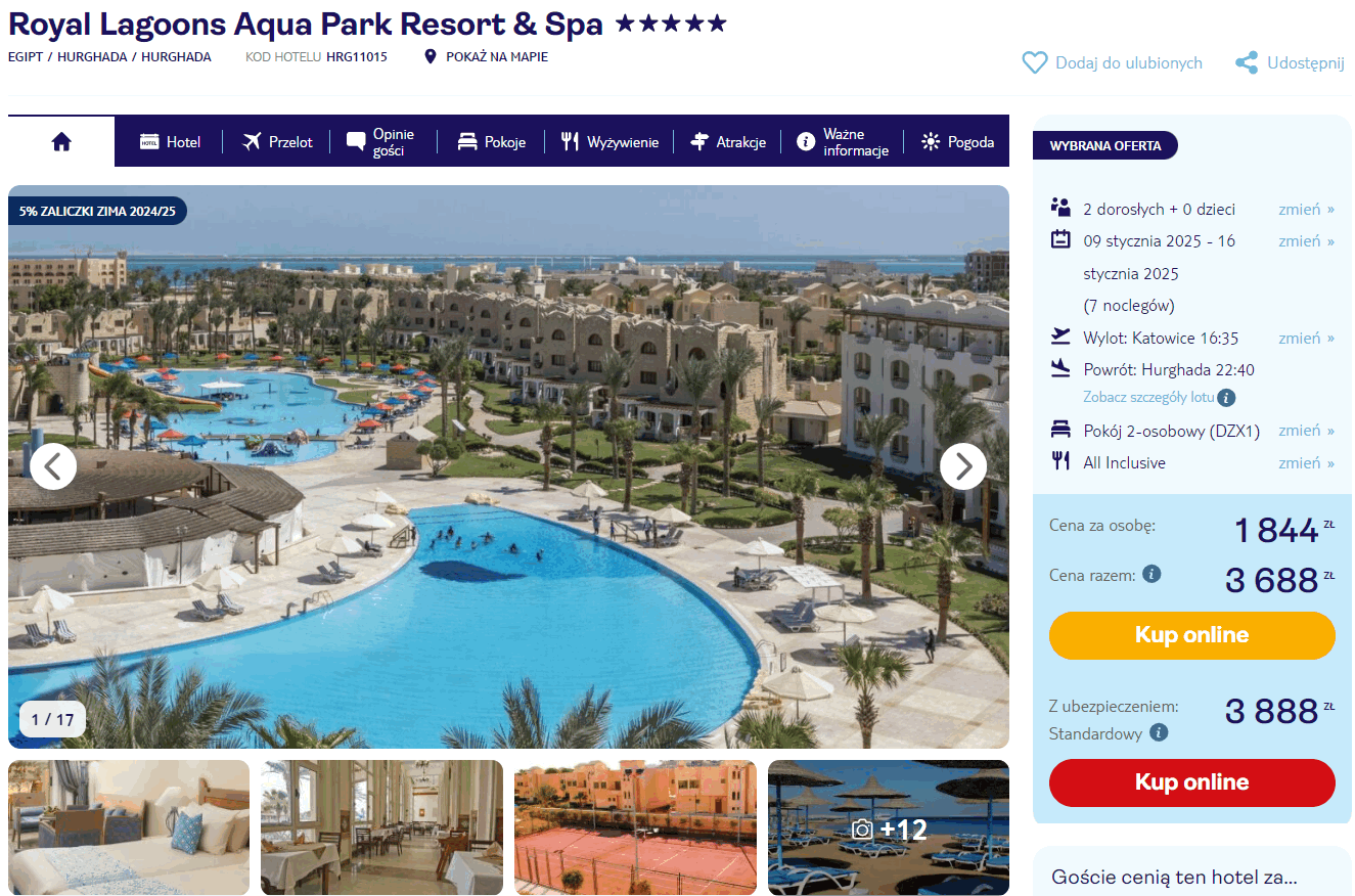 W cenę wliczone są przeloty (z bagażem rejestrowanym), opieka rezydenta, ubezpieczenie oraz all inclusive. Transfer z lotniska do hotelu i z powrotem jest dodatkowy płatny (130 PLN/2 osoby).