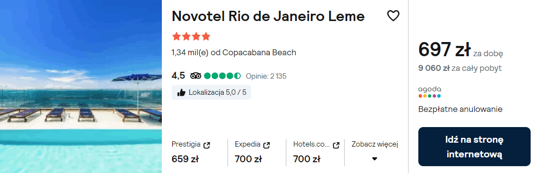 Jesteś w stanie wydać nieco więcej na zakwaterowanie? W takim razie zatrzymaj się w 4* hotelu Novotel Rio de Janeiro Leme, z odkrytym basenem na dachu.