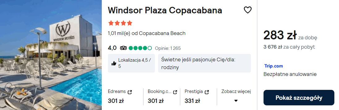 W Rio de Janeiro proponuję ci noclegi w 4* hotelu Windsor Plaza Copacabana z odkrytym basenem na dachu. Jak sama nazwa wskazuje, znajduje się on w bliskim sąsiedztwie plaży Copacabana.