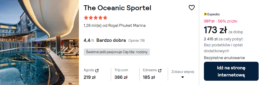 Tylko 4 PLN więcej kosztować cię będzie pobyt w 5* hotelu The Oceanic Sportel. Na miejscu zapewniony będziesz miał dostęp do sieci WiFi, centrum fitness oraz odkrytego basenu.