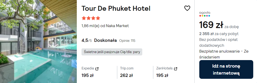 Na Phuket proponuję ci noclegi z codziennymi śniadaniami w 4* hotelu Tour De Phuket z odkrytym basenem. W każdym pokoju jest łazienka z prysznicem. Na terenie całego obiektu będziesz miał zapewniony dostęp do sieci WiFi.