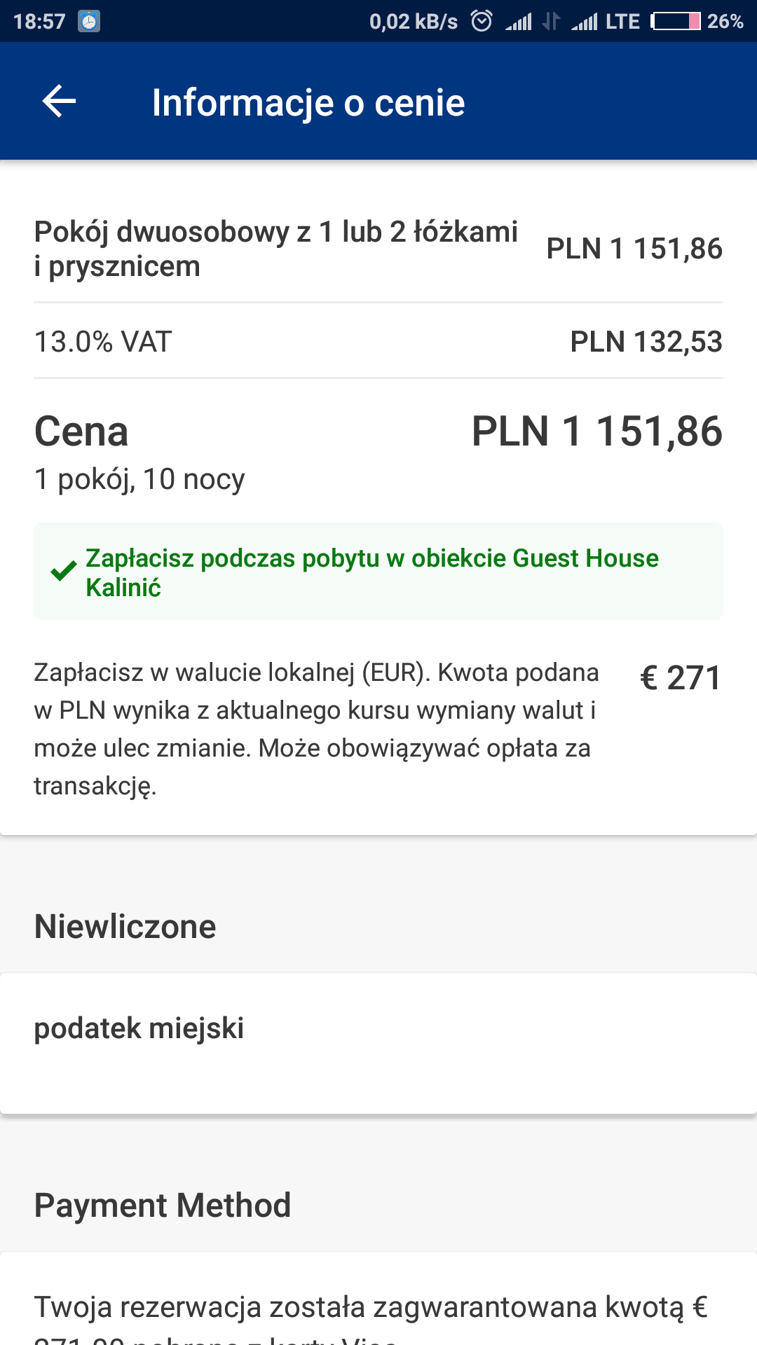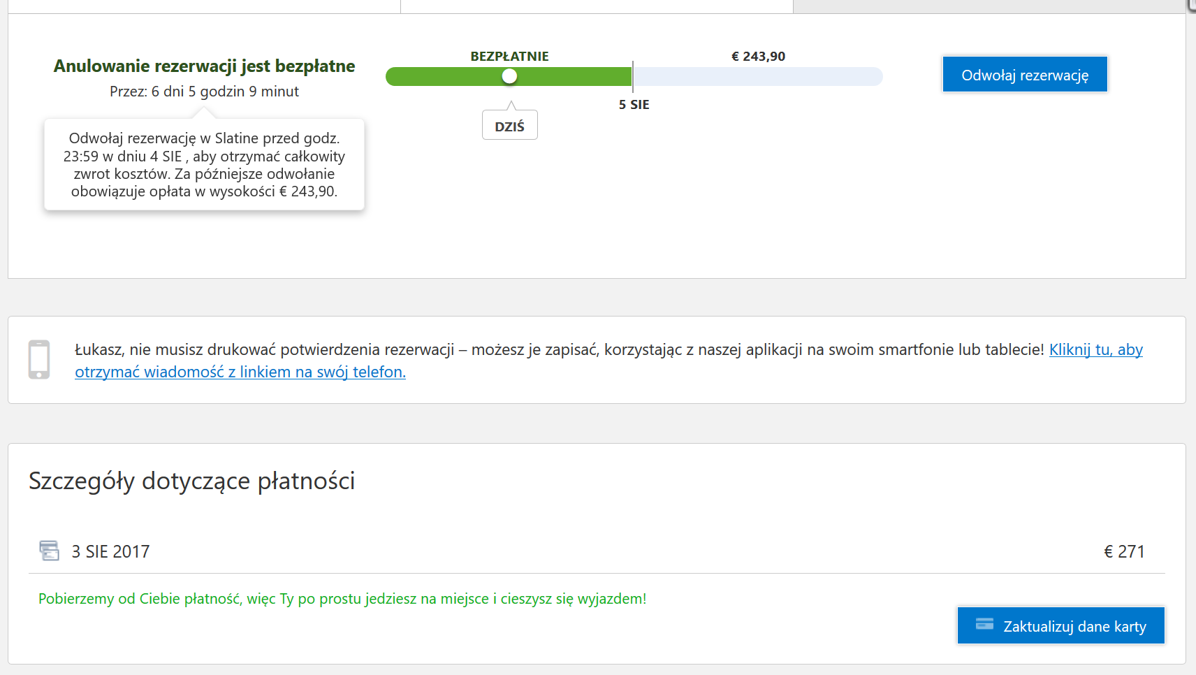 Mam już zarezerwowane, od dłuższego czasu. Teraz zbliża się termin do kiedy mogę za darmo odmówić i pytanie brzmi jaka będzie finalna metoda płatności. Bo na stronie mam inaczej i w apce inaczej, co widać na screenach powyżej. Zablokują kwotę na karcie czy płatność gotówką na miejscu?