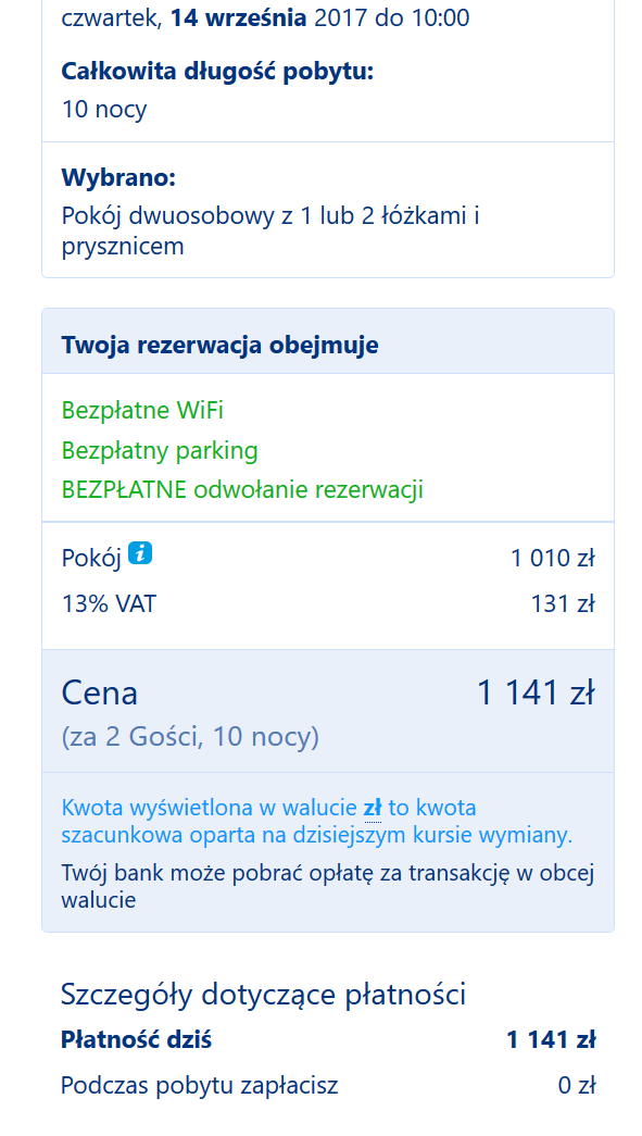 Na potwierdzeniu często jest cena orientacyjna np. w PLN przeliczona z kursu waluty danego kraju gdzie jest obiekt